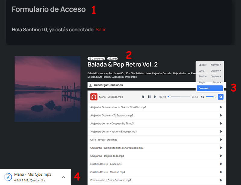 El reproductor está habilitado para probar la calidad de las canciones (Tarda aprox. 5 seg en cargar la canción).